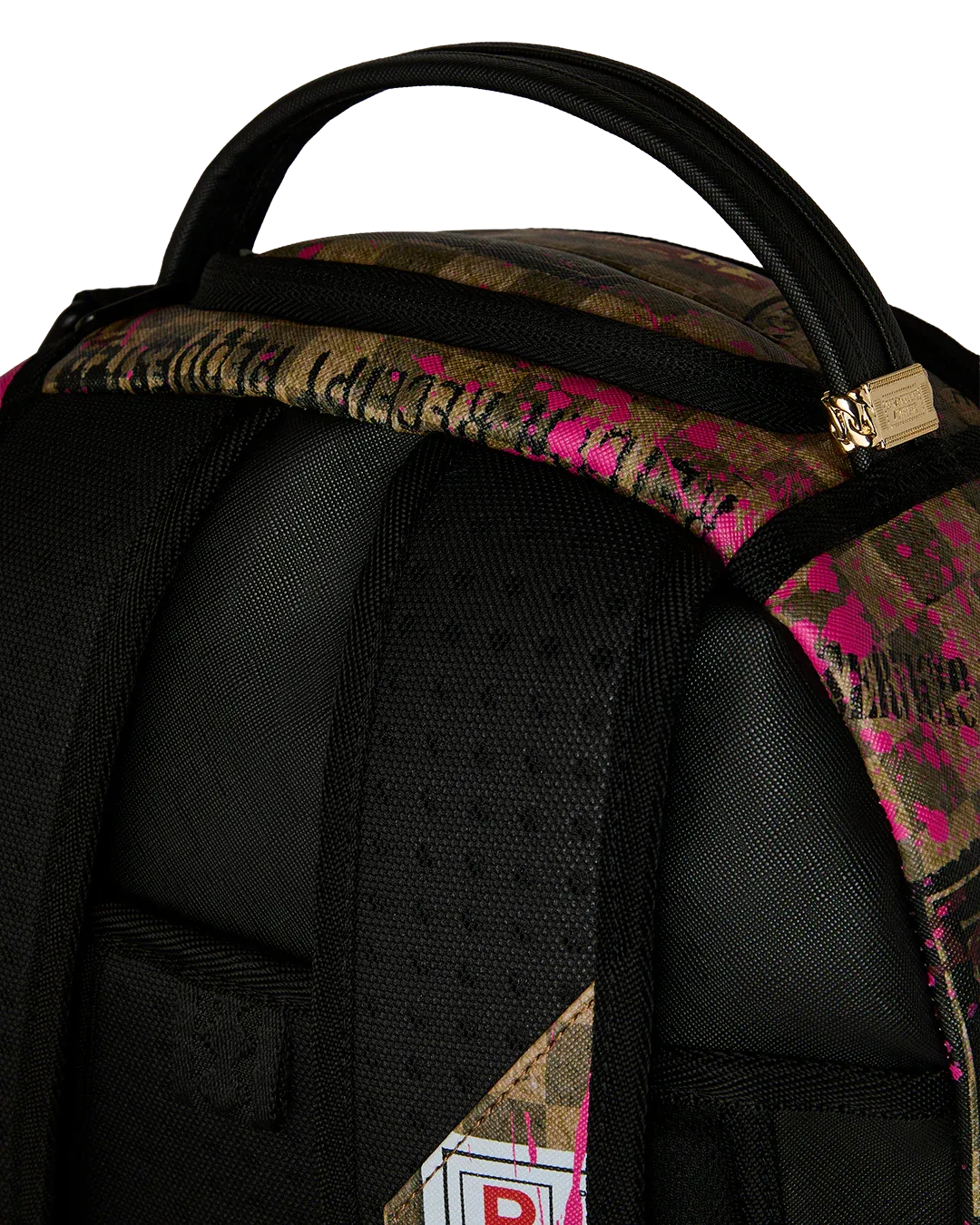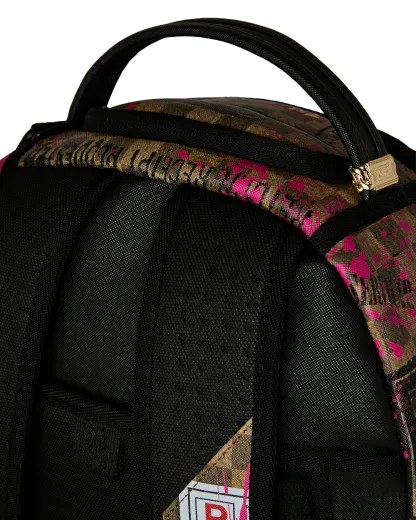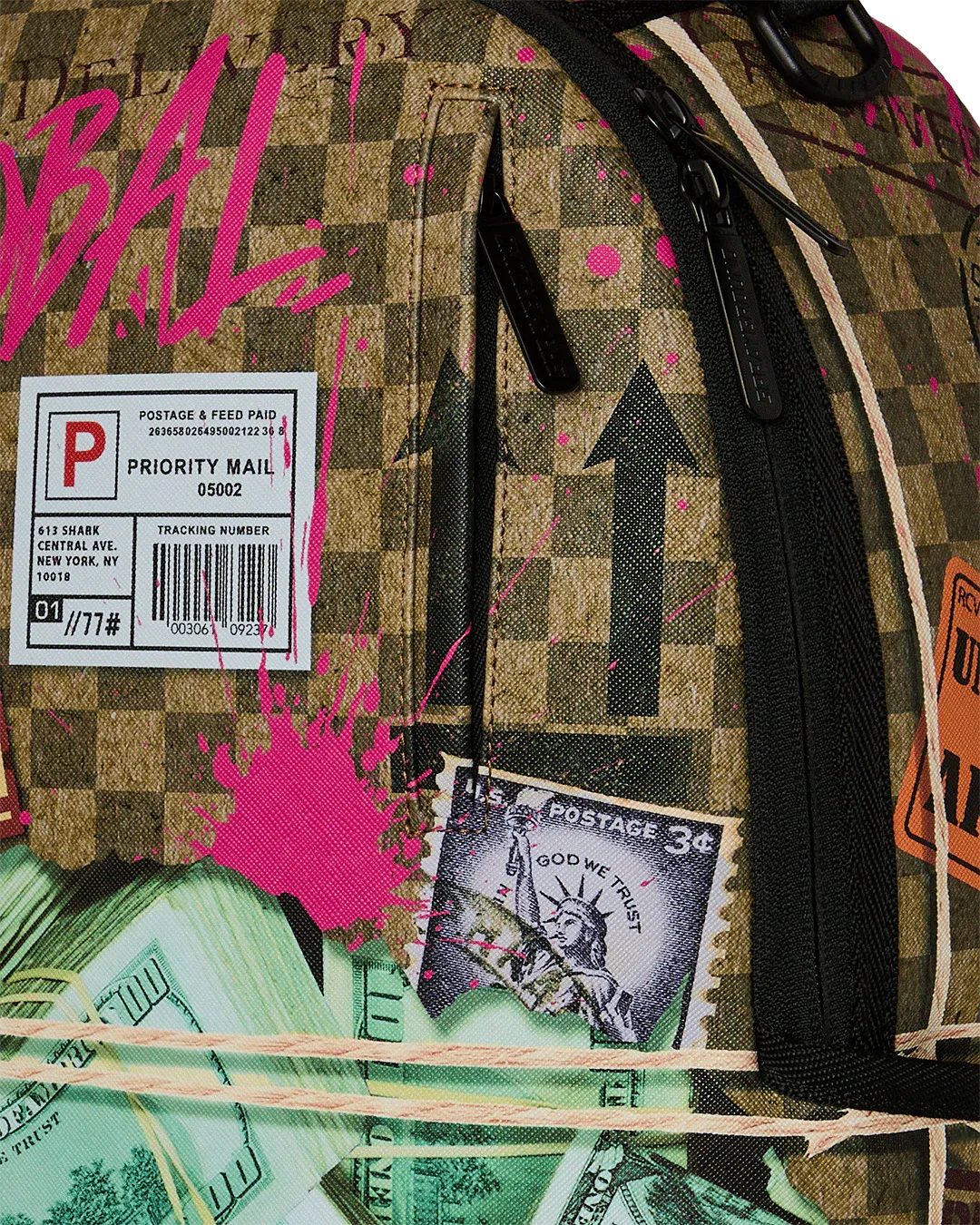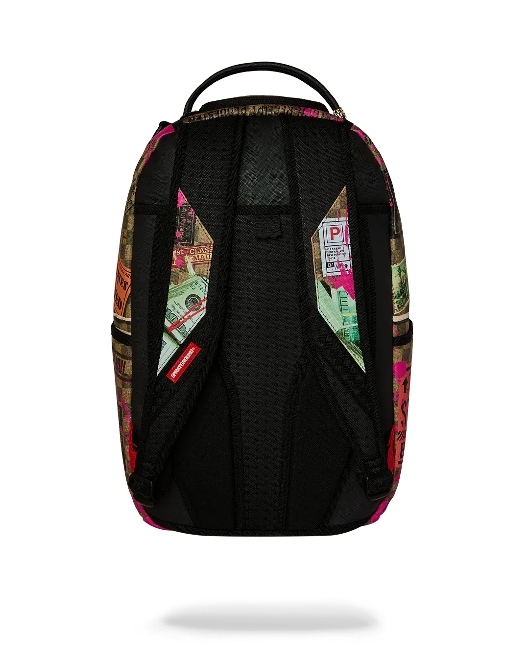 Dimensions: 18" x 6" x 11.5" • Front zipper pocket • Side pockets • Zippered Stash pocket • Separate velour sunglass compartment • Ergonomic mesh back padding • Adjustable Straps for custom sizing • Gold zippers with metal hardware • Metal "Sprayground Authentic" badge • Slide through back sleeve connects to carry-on luggage to free your hands